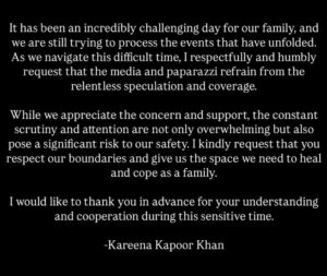 Expressing her shock over the incident Kareena Kapoor said, “It has been an incredibly challenging day for our family, and we are still trying to process the events that have unfolded. As we navigate this difficult time, I respectfully and humbly request that the media and paparazzi refrain from the relentless speculation and coverage.”