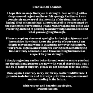 Meanwhile, Bollywood actress Urvashi Rautela apologised to Saif Ali Khan for her ignorance about gravity of the incident regarding the attack on him and flaunting her costly bracelet while giving her reaction to the media on the attack.