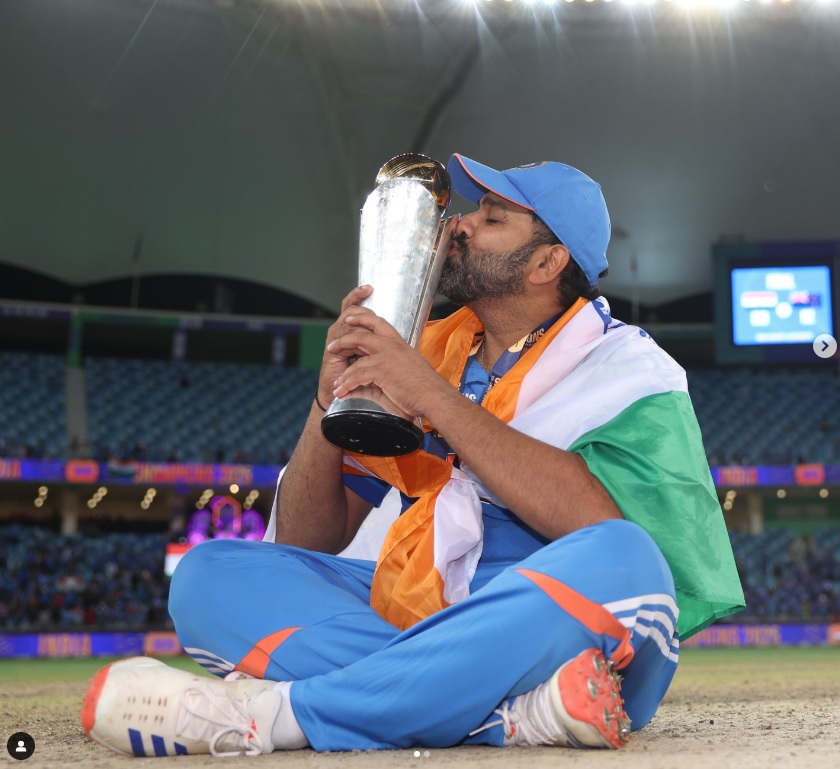 India team captain Rohit Sharma with ICC Champions Trophy, 2025